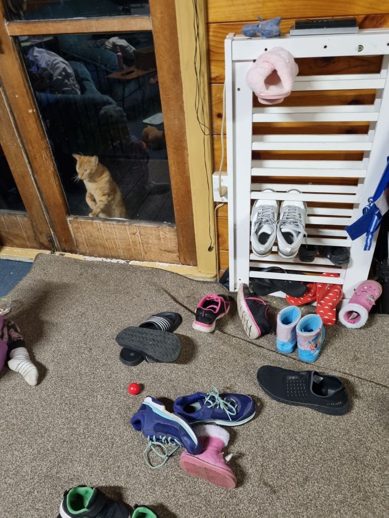 So when our old bed finally kicked the bucket, I had a lightbulb moment and made some plant holders, a small couch, and a shoe rack out of it. I was quite proud of my creations! Easy to put away and easy to grab! It even has a bit on the end. I couldn’t be bothered to saw off, which serves as a bag holder. After admiring my masterpiece, putting it up on the wall and feeling rather proud of myself…reality hit. You see, I forgot one tiny detail: This amazing creation only works if the people in the house actually use it. Which, of course, they don’t.