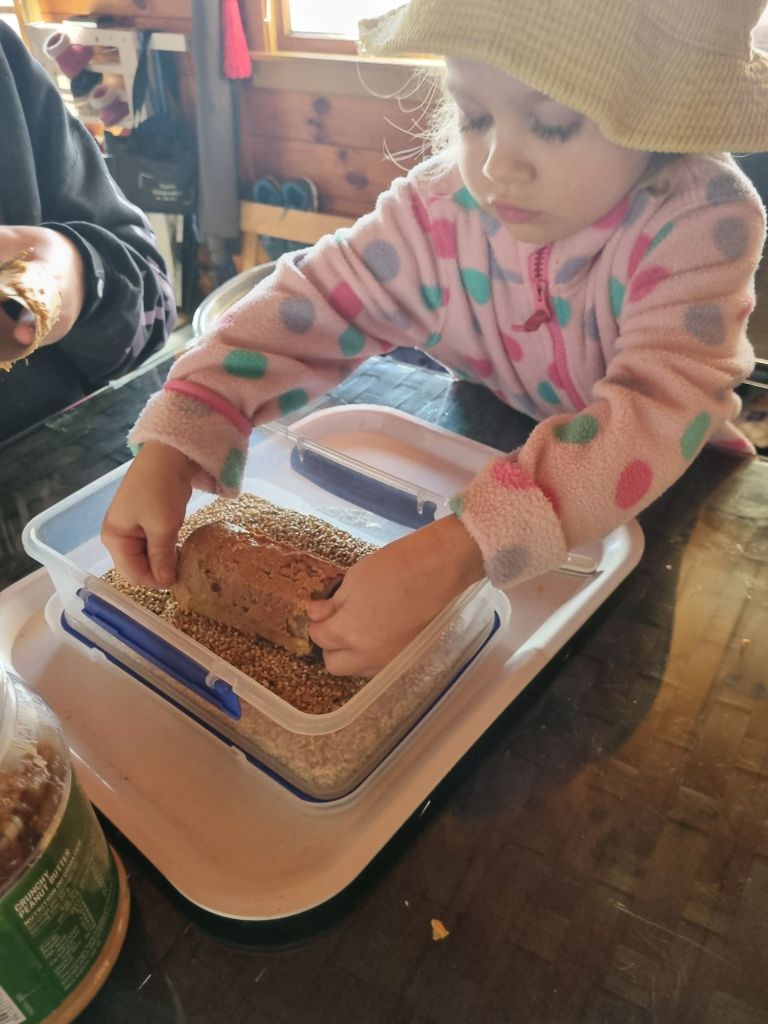Have your child hold the toilet roll while you help them spread a generous layer of peanut butter all over the outside. It doesn’t have to be perfect, just enough for the seeds to stick. - Roll it in seeds: